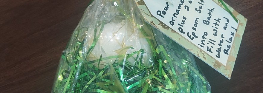 Add a tag that states, “Pour one ornament plus 2 cups of Epsom Salt into the bath. Fill with water and relax.” or “Pour Bath Starter plus 2 cups of Epsom Salt into the bath. Fill with hot water and relax.”