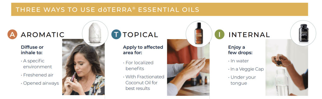 - ATI – The bottle’s label should be marked with usages: aromatic (A), topical (T), or internal (I).
